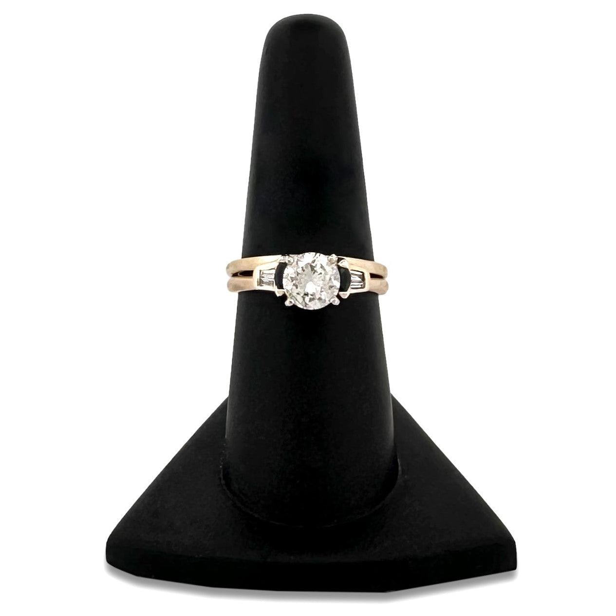 A lovely bridal set with a touch of color. The engagement ring is a 0.75 carat round brilliant diamond solitaire that is beautiful by itself. Then we add the matching wedding band that is set with marquise cut blue sapphires and tapered baguette diamonds. The band hugs the solitaire for when you say your, "I do." Set in 14 karat yellow gold with white gold prongs.