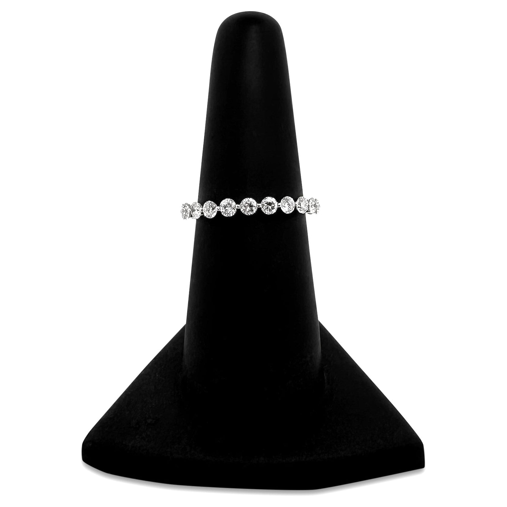 This dazzling diamond eternity band has 22 round brilliant diamonds set single-prong style to showcase the diamonds. 1.30 carats total weight of round brilliant cut diamonds appear to float in 14 karat white gold.