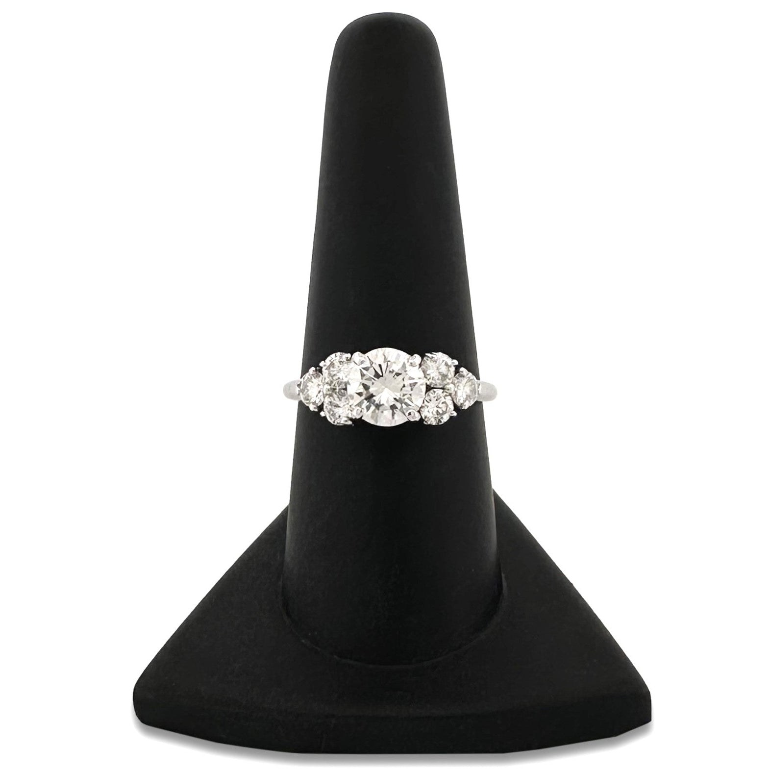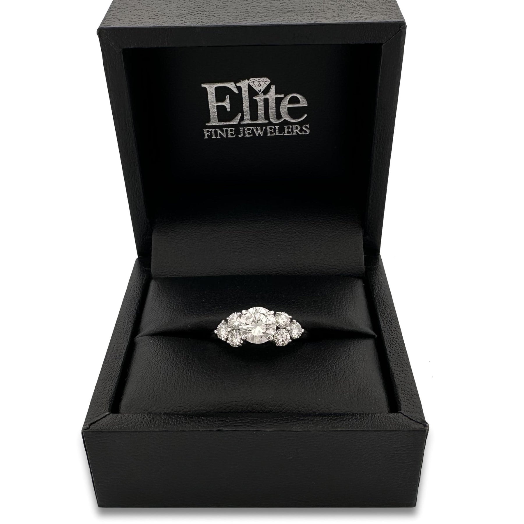 A classic earth-mined diamond engagement ring. Our ring centers on a 1.17 carats round brilliant. On each side are three round brilliants that form clusters that hug the center diamond. Set in 14 karat white gold. Simply elegant!