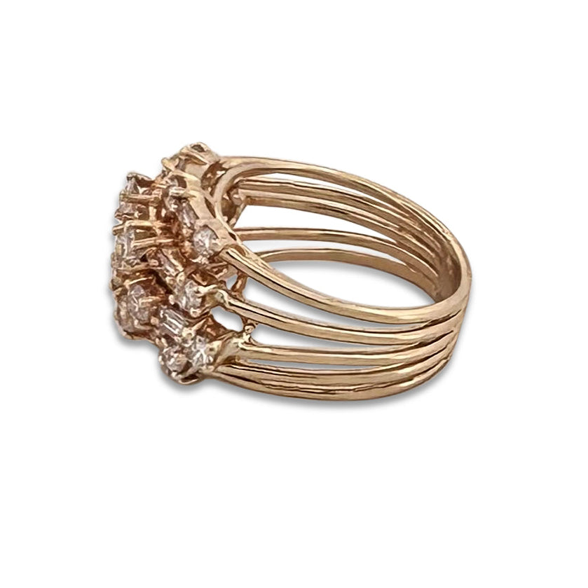 A dynamic earth-mined diamond fashion ring. Five rows with round brilliants alternating with baguette cuts sparkle in this fun ring. Set in 14 karat yellow gold and ready to shine for you!