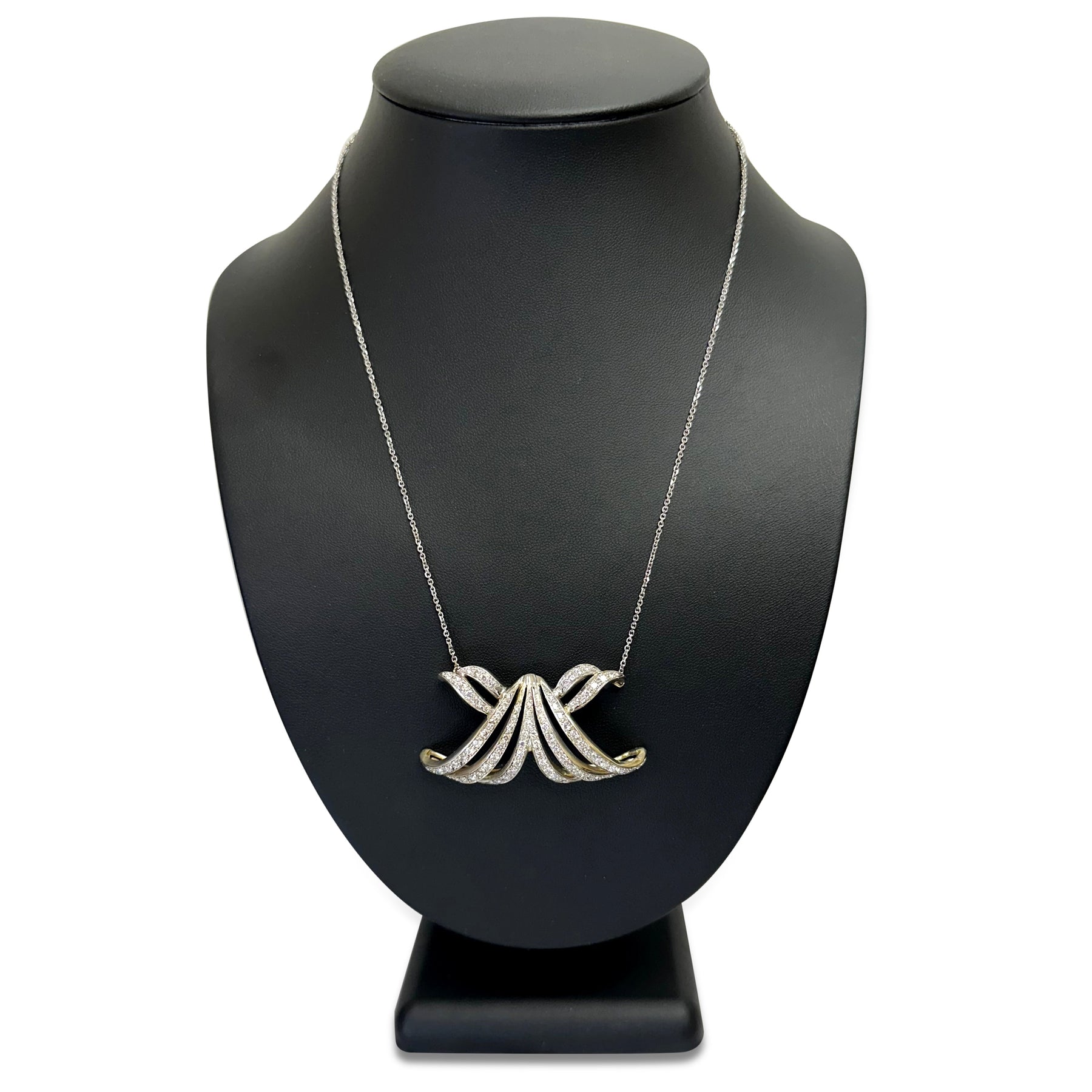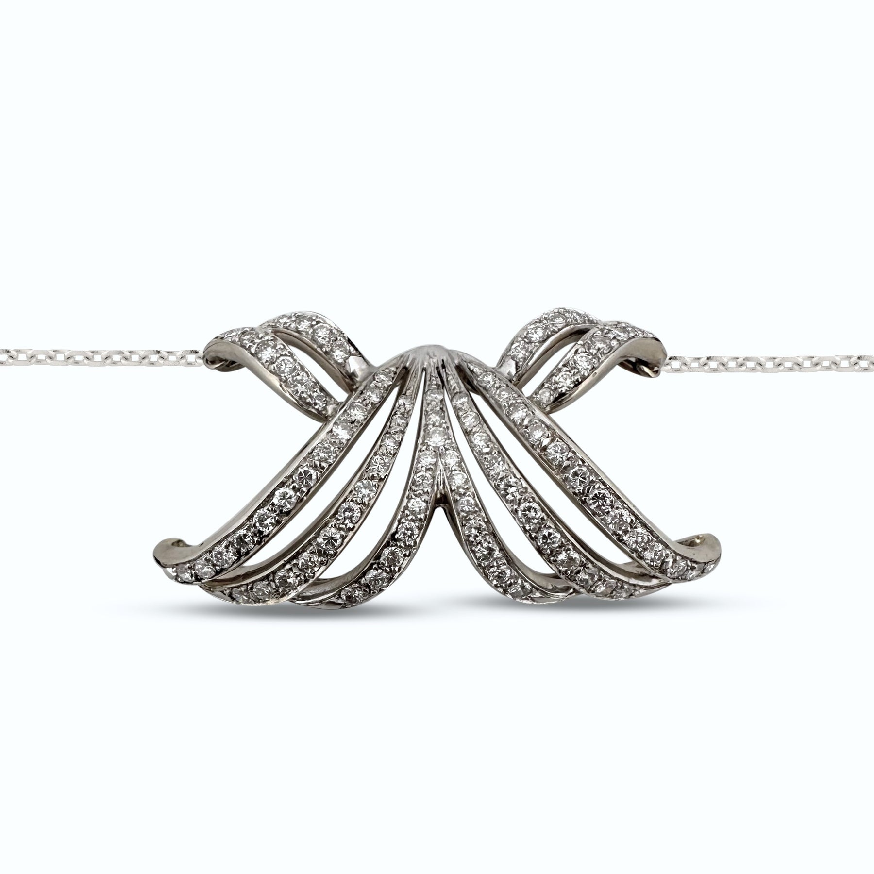 Beautiful earth-mined diamond ribbon necklace. Two carats of round brilliant diamonds form a sculptural, bow-like pendant. Set in 14 karat white gold on an attached 18 inch chain. A lovely necklace for your someone special.