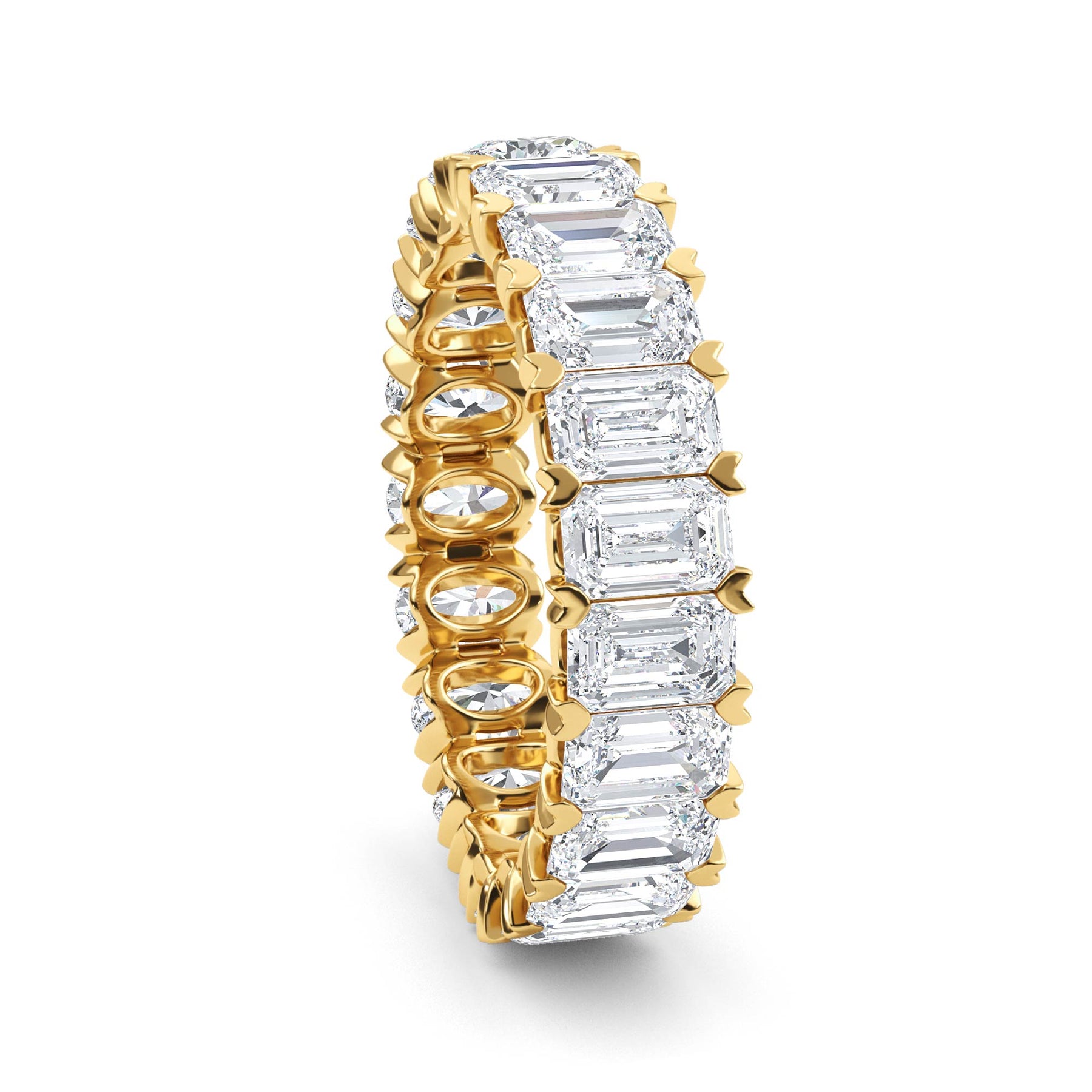 Who doesn't love variety? Alternate between showing off the sparkling emerald cuts, or the ovals or both! This fashionable 3.79 carats total weight lab-grown diamond eternity band has emerald cuts on one half, and ovals on the other half. Choose 14 karat white, yellow or rose gold. For the spice of life!