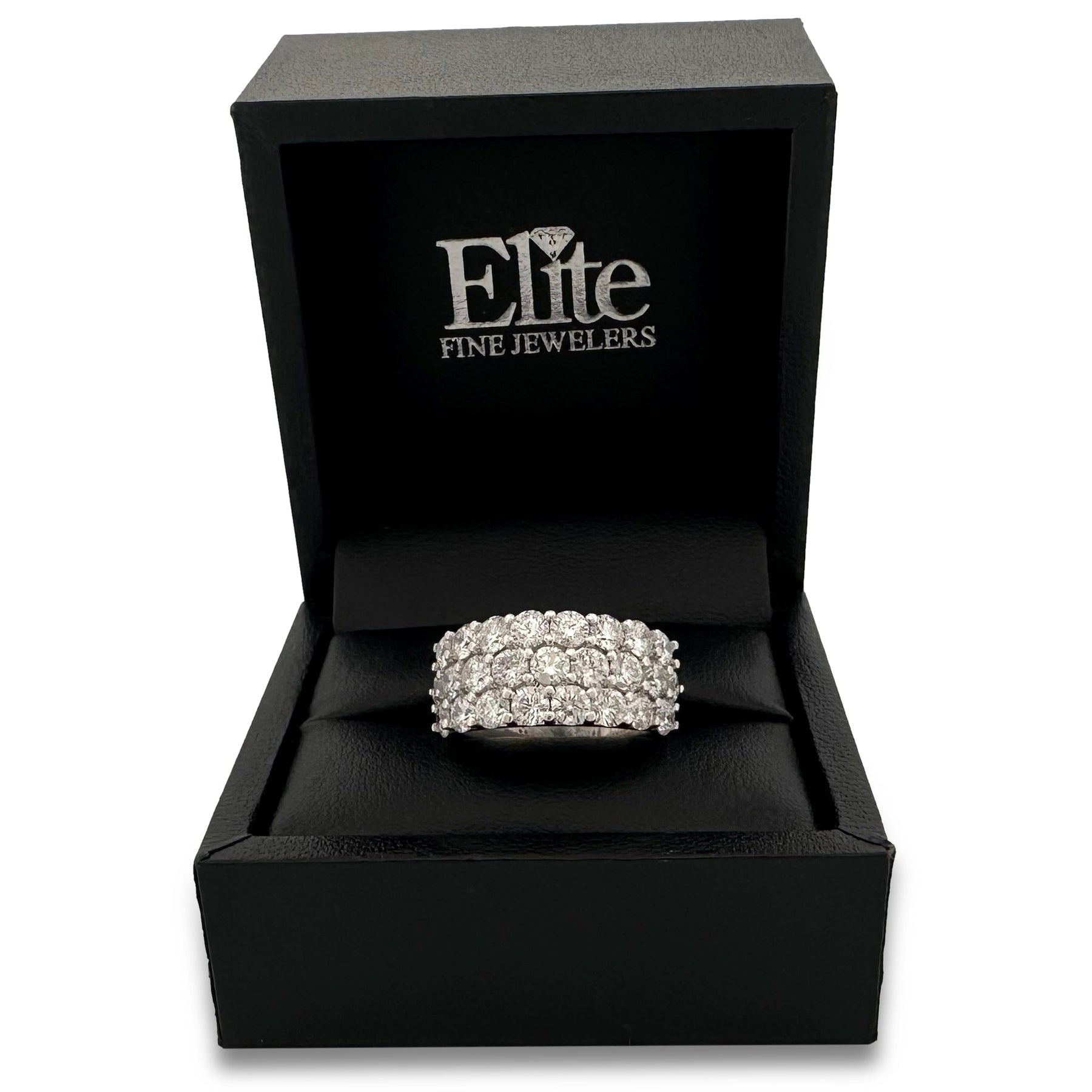 Bring on the bling! An estimated 3 carats total weight of earth-mined round brilliant cut diamonds are set in three rows. Set in 14 karat white gold with shared prongs for maximum sparkle. Wear it as an anniversary band, a vacation ring or just for fun. You deserve it!