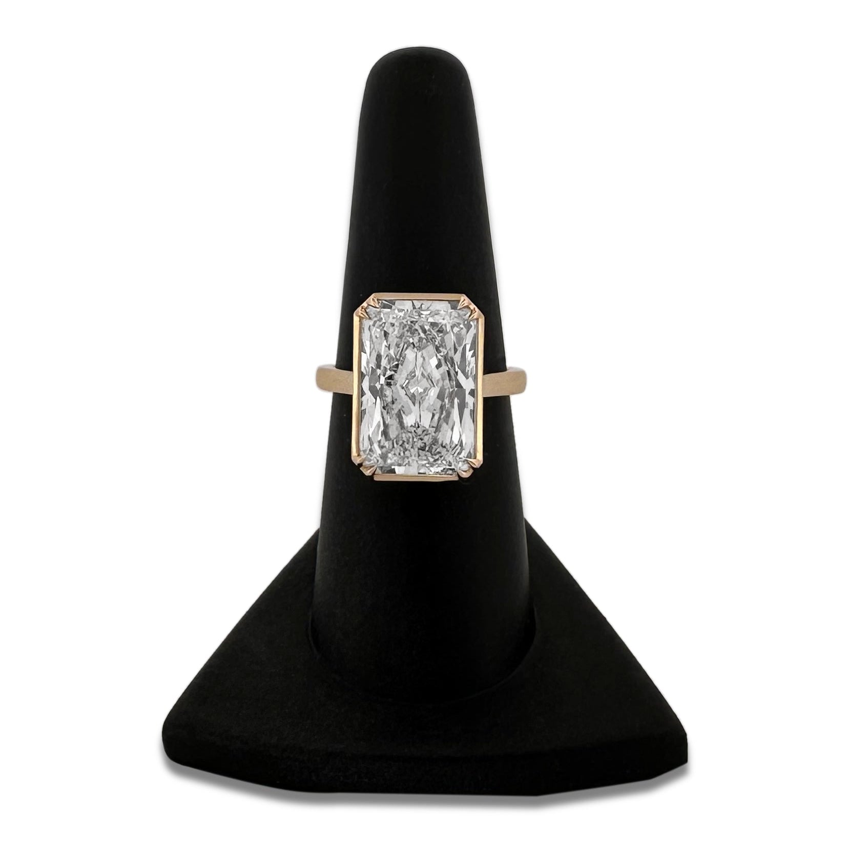 An astonishing radiant cut lab-grown diamond solitaire. This amazing 10.02 carat radiant cut was certified by IGI as G color and VS2 clarity. It is perfectly framed by a bezel-setting with double prongs on a simple band. Set in 14 karat yellow gold. Guaranteed to astound your beloved.