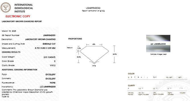 Chic and streamlined emerald cut lab-grown diamond engagement ring. This three-stone ring centers on a 2.01 carat emerald cut that has been certified by IGI as E color and VVS2 clarity. On the sides are two baguettes that keep the icy, step-cut vibe going. All three stones are bezel set to accentuate their outlines and set on a simple gold band. Choose 14 karat yellow, white or rose gold.