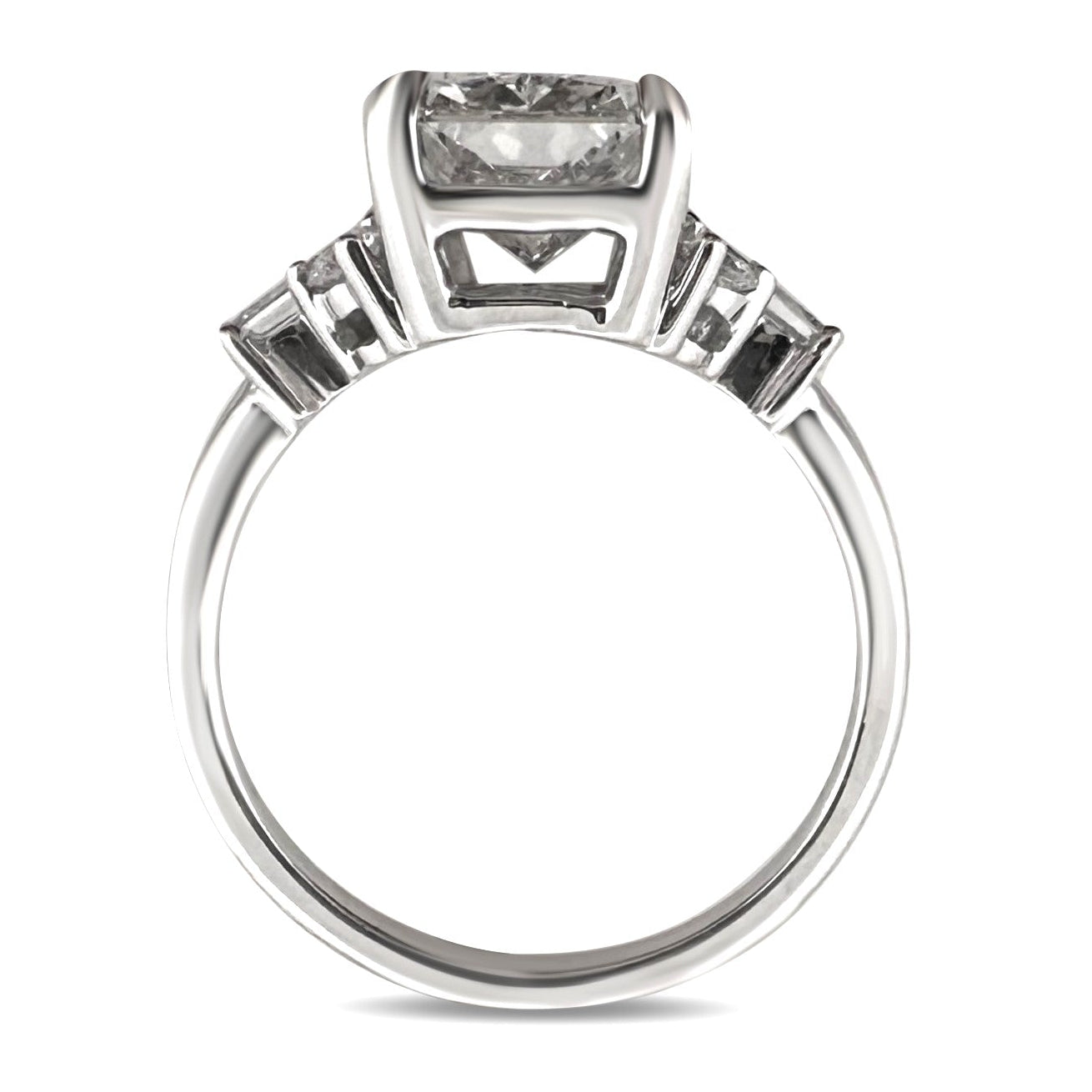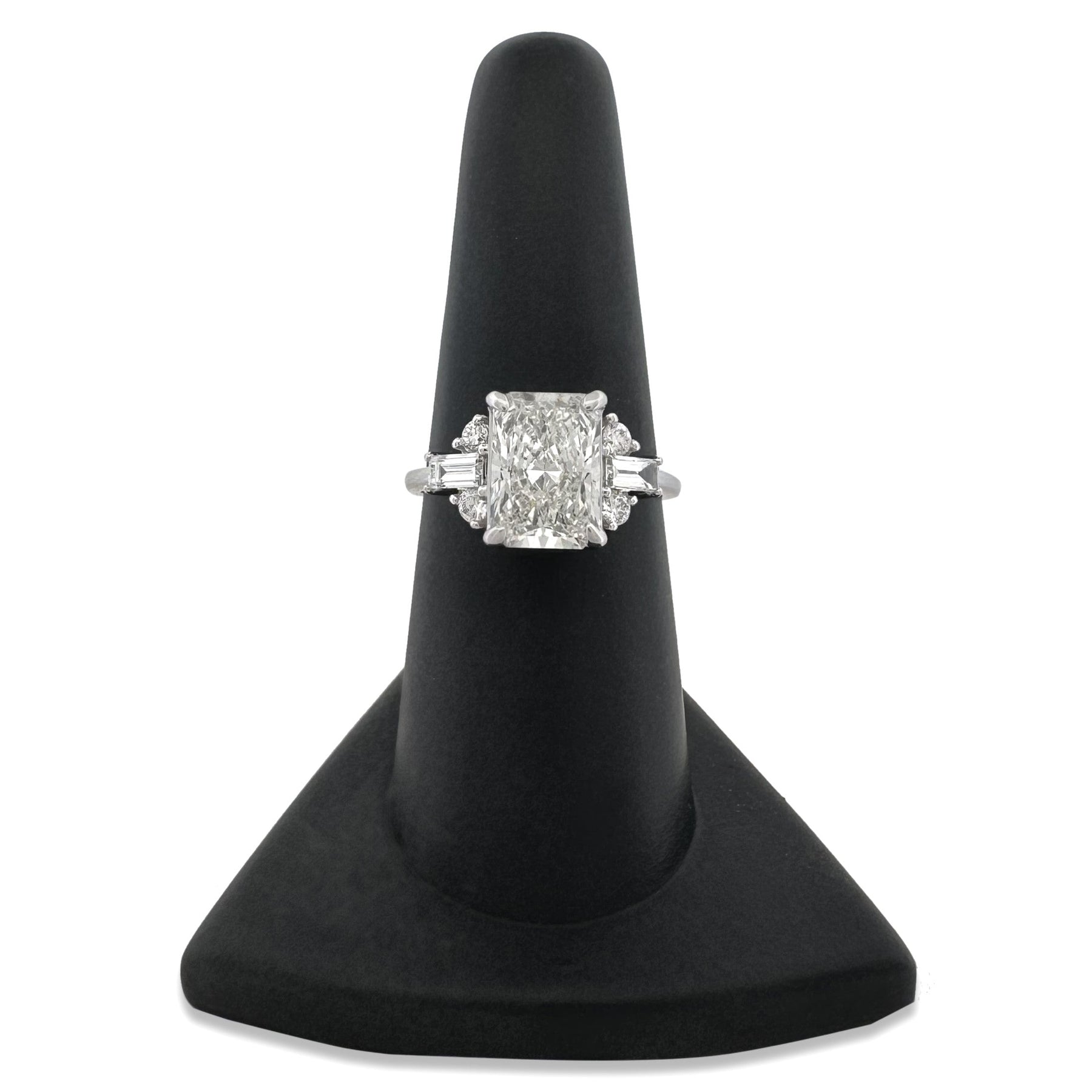 Created in 1977, radiants are a newer cut, but already a favorite! You get an elongated shape - like an emerald, but better brilliance because radiants have brilliant cut facets. Our ring centers on a 2.76 carat radiant that has been certified by IGI. On the sides, baguettes and rounds create a beautiful design. It sparkles with 3.20 carats total weight of bright, lab-grown diamonds set in 14 karat white gold.
