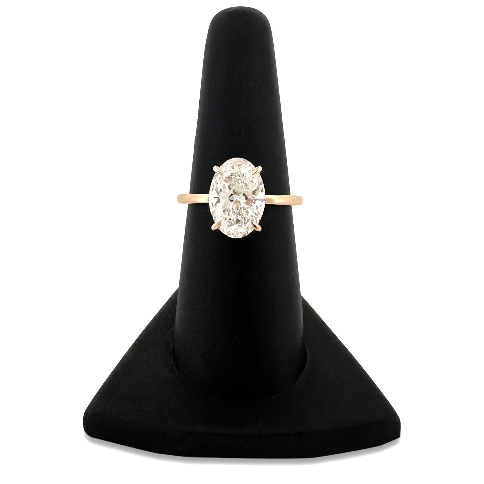 Beautiful oval cut lab-grown diamond engagement ring. Featuring a 3.04 carat oval brilliant, certified by IGI as E color and VS1 clarity. Kept secure with claw prongs and accented underneath with a hidden halo of round brilliants. Set in 14 karat yellow gold, on a simple gold band. A ring she will treasure for your forever together.