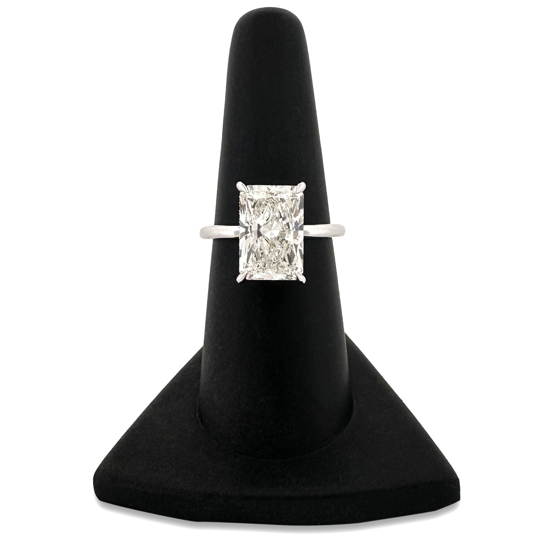 An elegant radiant cut hidden halo lab-grown diamond engagement ring. Centering on a 5 carat elongated radiant cut certified by IGI. It is set with claw prongs to keep it secure and add a touch of drama. Underneath, round brilliants form a hidden halo. Set on a sleek, 14 karat white gold band. An enduring design for your eternal love.