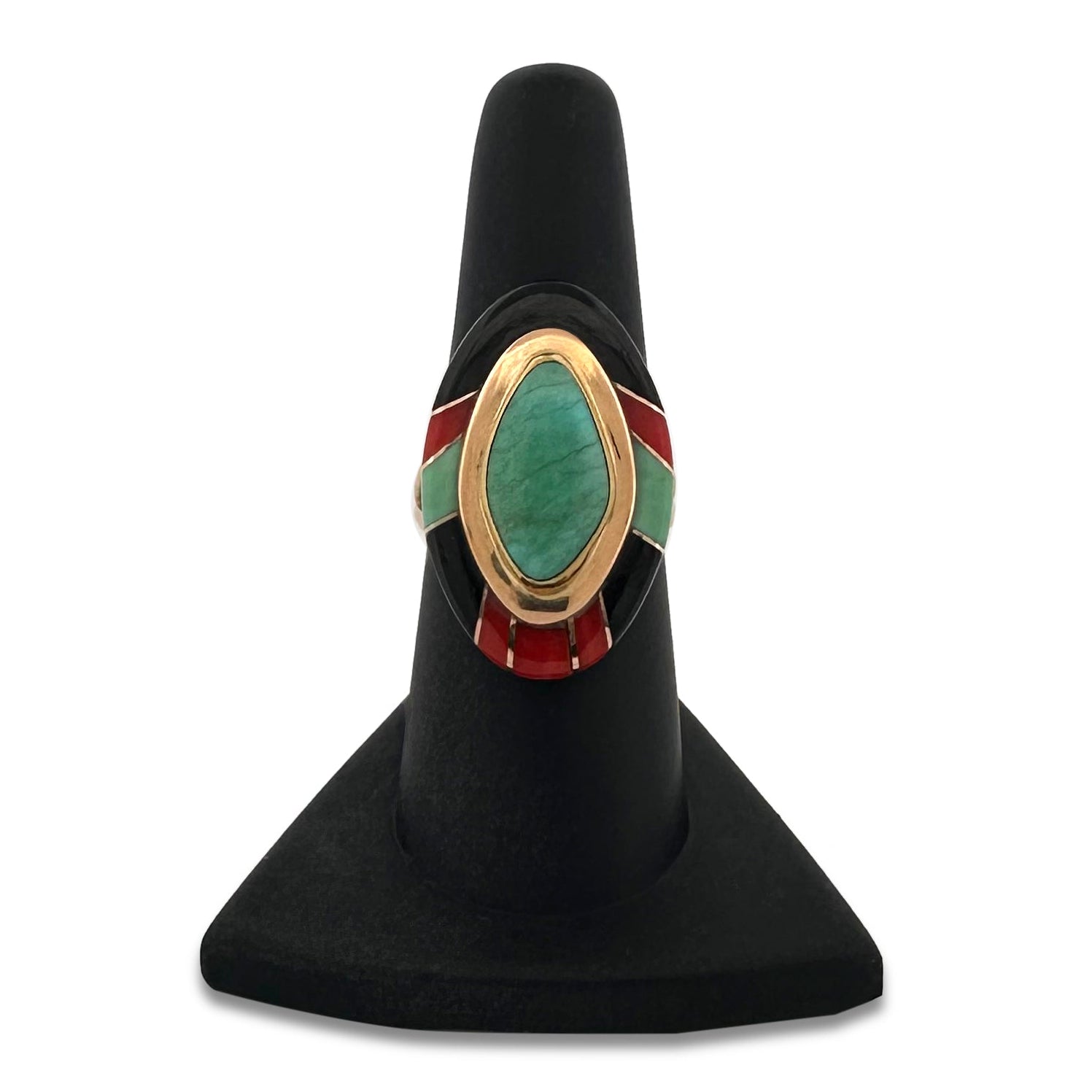 A beautiful gemstone inlay ring by artist Michael Rogers. Rogers is known for his quality inlay skills and bold, geometric designs. In the center, is a bezel-set turquoise. Additionally, onyx, coral and turquoise seem to radiate from the center with beams of gold. Set in 14 karat yellow gold. A rare treasure!