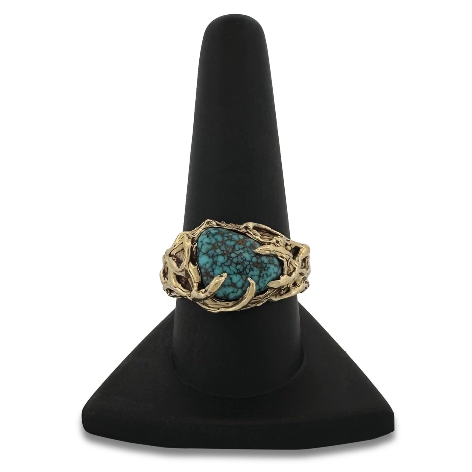 A tempting turquoise cocktail ring. Featuring a beautifully webbed, triangular turquoise. The turquoise is embraced by branches of gold in its organic-style setting. In 18 karat yellow gold.