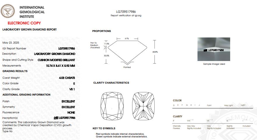 An elegant elongated cushion cut lab-grown diamond engagement ring. Centering on a 4.03 carat cushion certified by IGI as E color and VS1 clarity, set with claw prongs to keep it beautifully secure. Round brilliants run down the shoulders and form a hidden halo. Over 5 carats total weight are set in 14 karat white gold. Get ready for a, "Yes!"