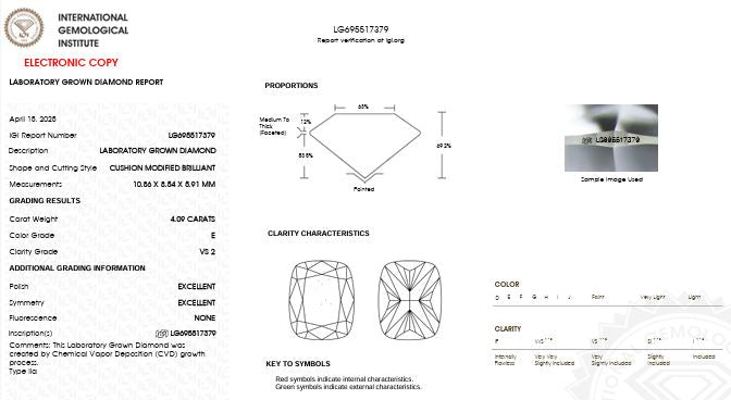 Make her wildest dreams come true with this cushion cut lab-grown diamond engagement ring. Centering on a 4.09 carat elongated cushion cut, that was certified by IGI as E color and VS2 clarity. It is set with claw prongs in a cathedral-style setting. The undergallery is accented with round brilliants that subtlety add a touch of extra sparkle for the wearer's enjoyment. Set in 14 karat yellow gold. An instant classic!