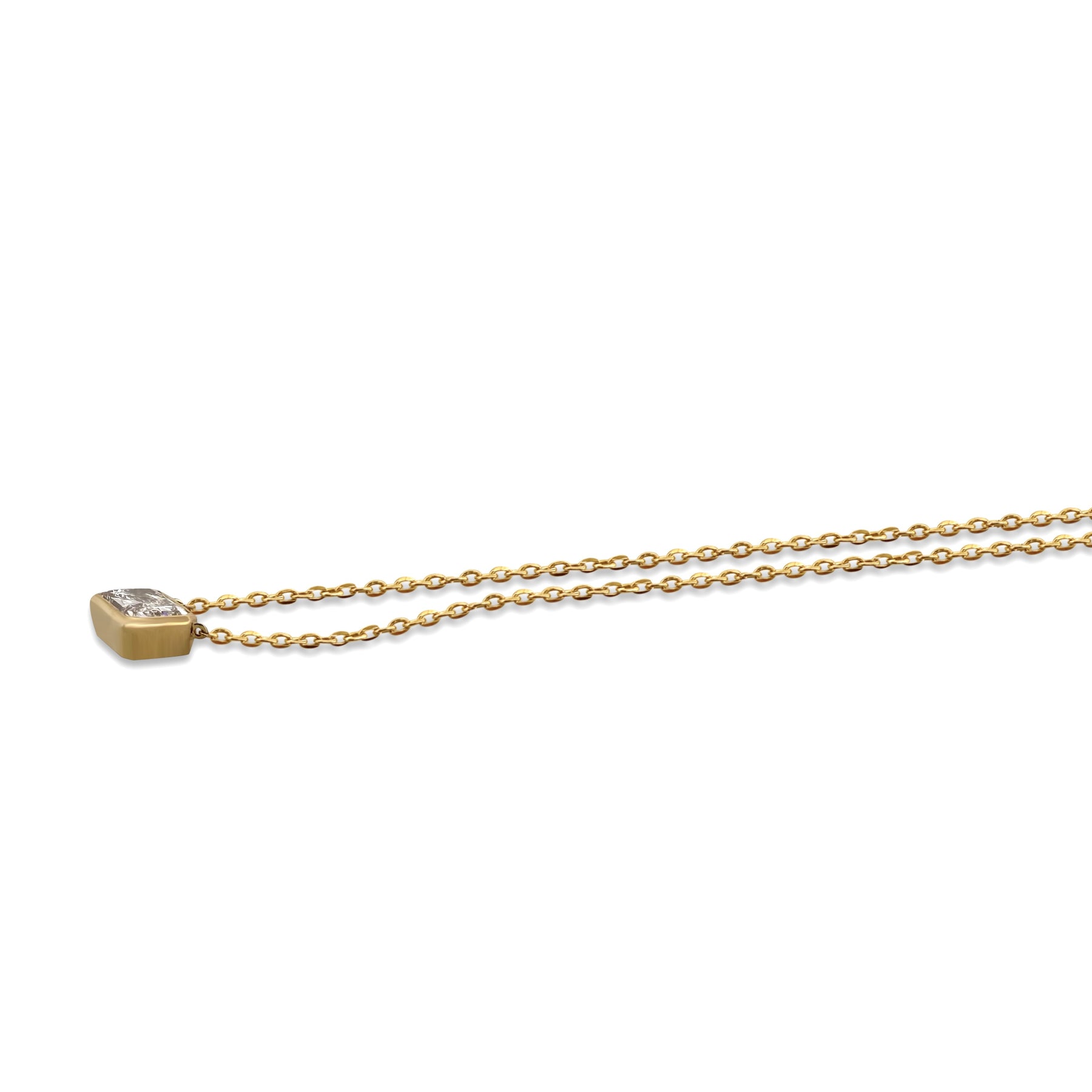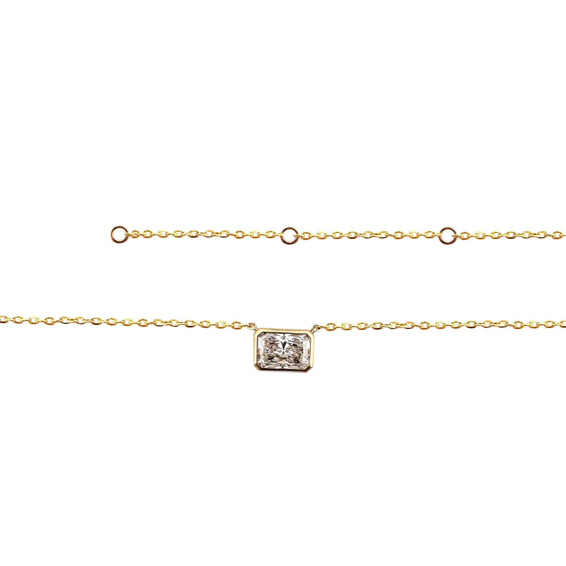 Bold radiant cut lab-grown diamond floating necklace. A 1.50 carat radiant cut is bezel-set to accentuate its outline and attached to a cable chain with adjustable lengths. Set in 14 karat yellow gold. An instant classic!