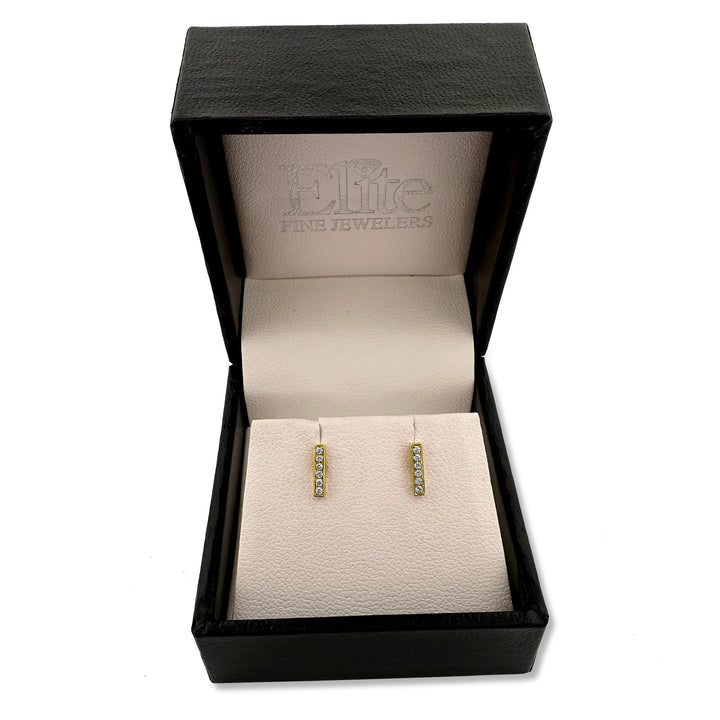 These trendy diamond bar earrings have 12 earth-mined, round brilliant cut diamonds, totaling 0.05 carat. Set in 14 karat gold, with your choice of yellow, white, yellow or rose. Great for everyday. Try them as your seconds.
