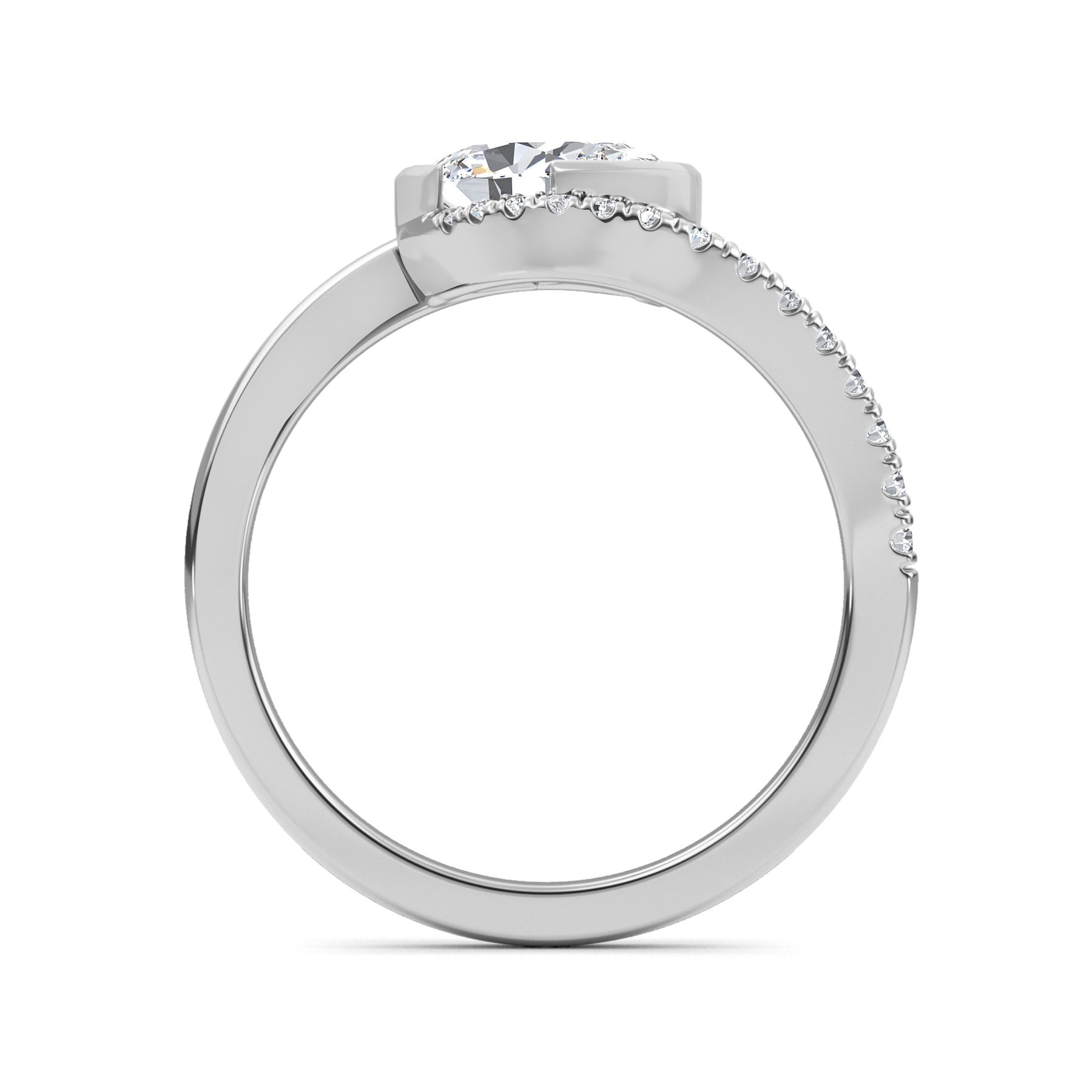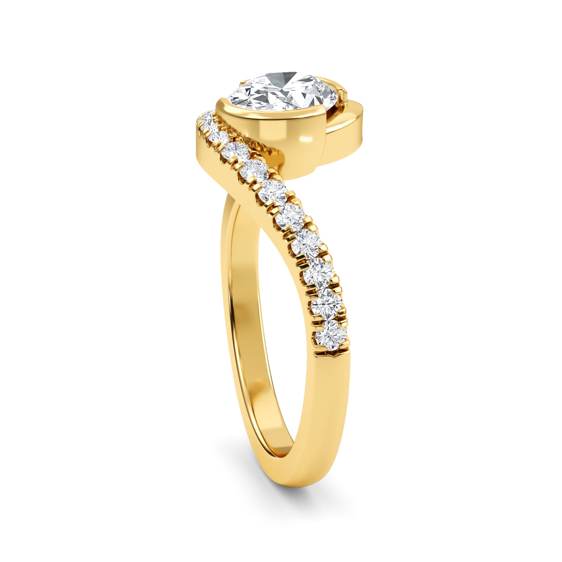 A striking oval engagement ring. Centering on a 1.01 carat oval brilliant lab-grown diamond, certified by IGI as E color and VS1 clarity. It is bezel-set, diagonally in a bypass setting that curves with the oval. Round brilliants trail down one of the shoulders to create a dynamic looking ring! Choose 14 karat yellow, white or rose gold.