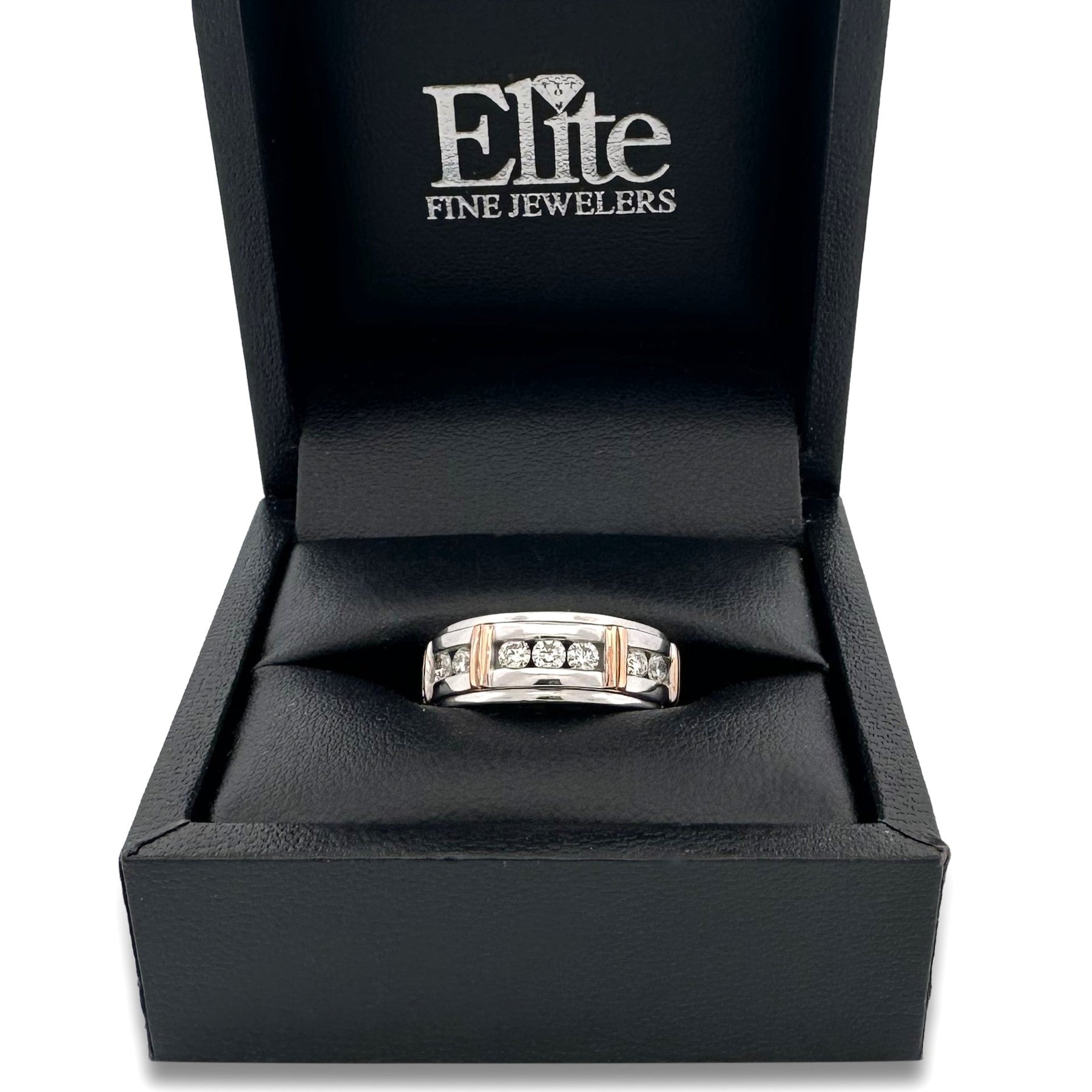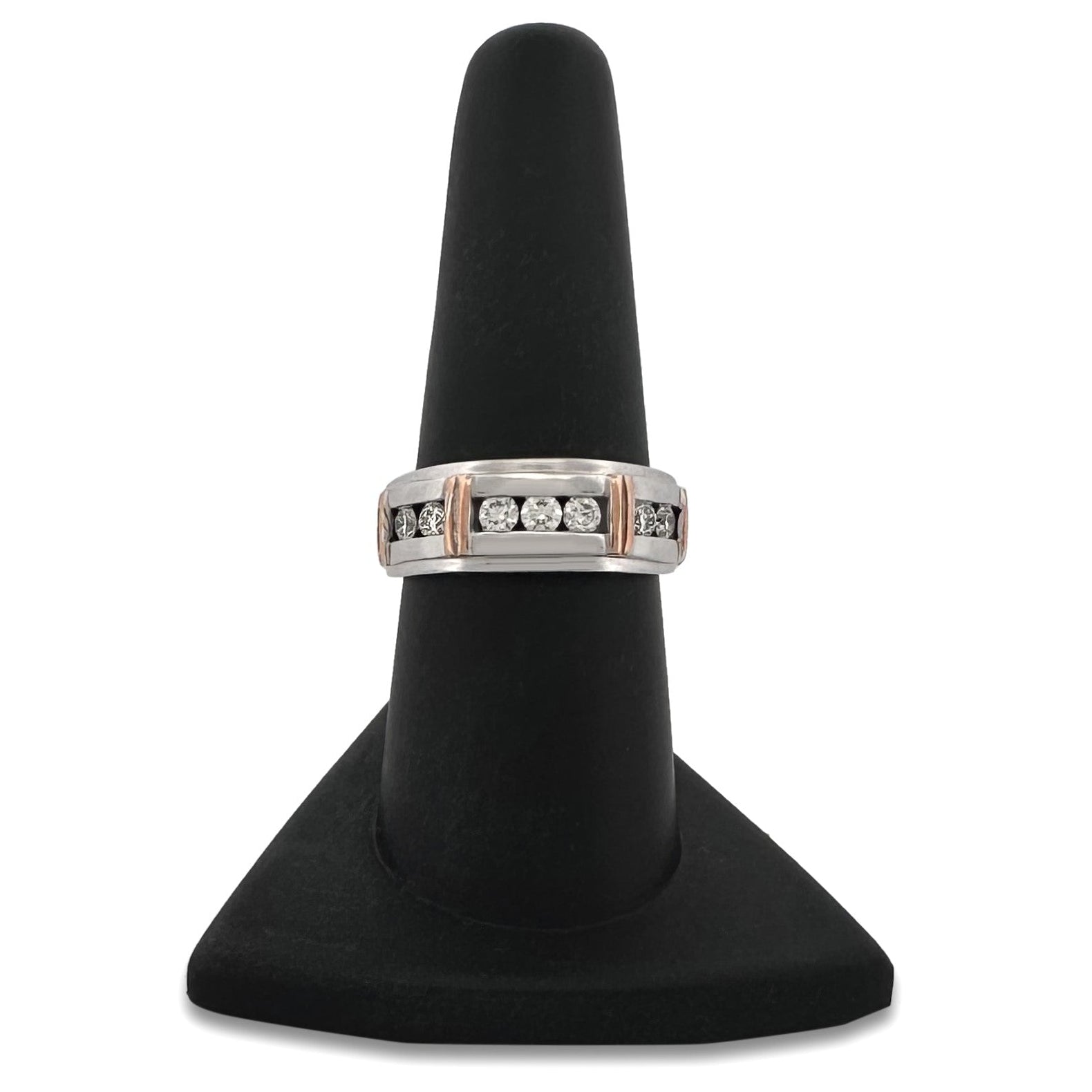 A classic diamond band with a touch of color. Round brilliants are channel set for smooth, prongless wear. Set in 10 karat white gold with rose gold accents. Wear as a wedding or anniversary band or as a fashion band.