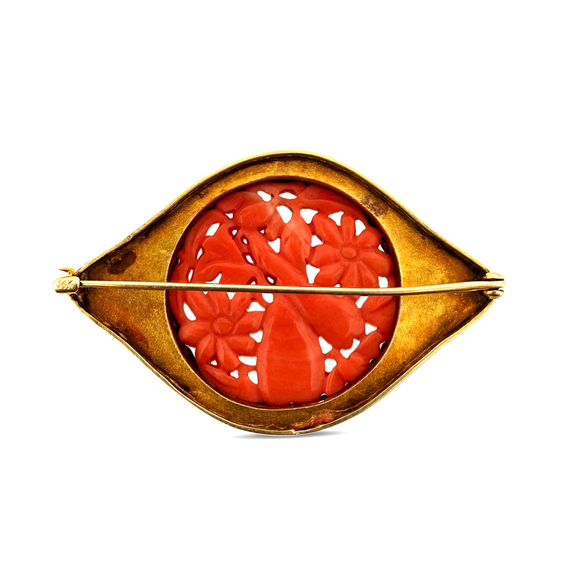 Antique Carved Coral and Enamel Brooch in 14k Yellow Gold