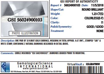 GSI Graded 1.23ctw Round Brilliant Natural Diamond Stud Earrings in 18k Yellow Gold