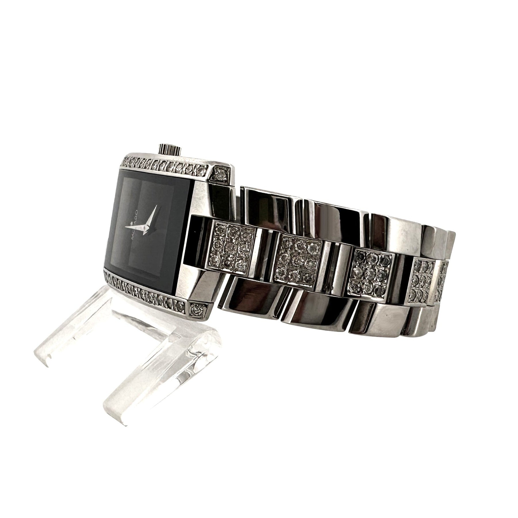 Pre-owned Movado Eliro diamond bracelet watch. This striking watch has a black rectangular dial lined with round brilliant diamonds that continue down the center bracelet links. An estimated 2.50 carats total weight of natural diamonds are sure to brighten up your wrist. The watch is in very good condition, with normal signs of wear. It does not have an original box or original papers.