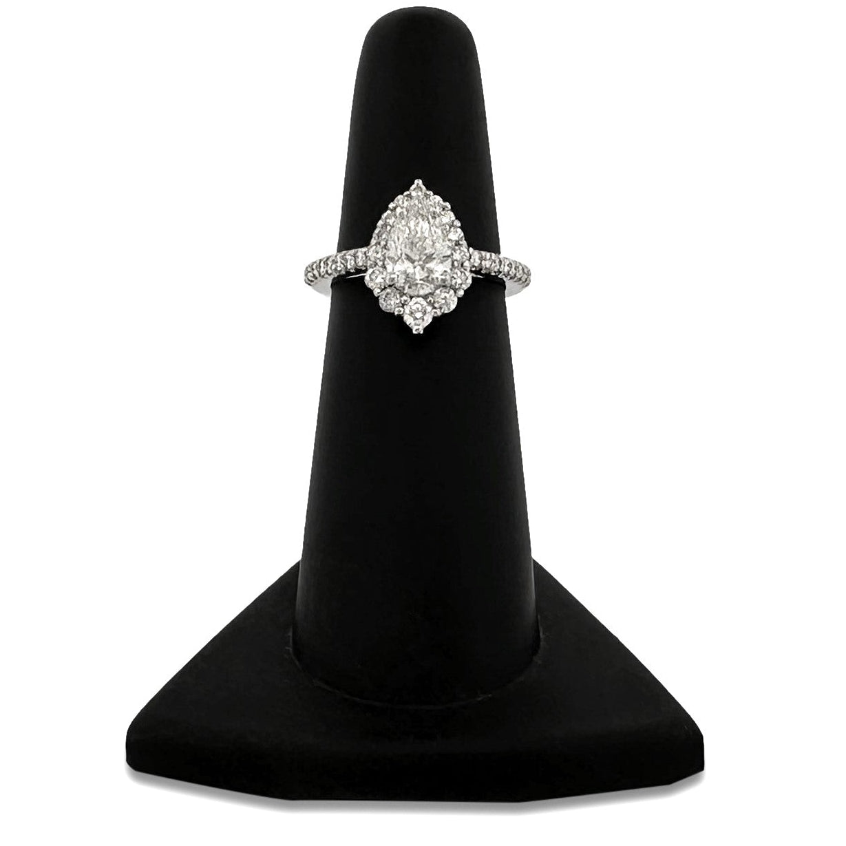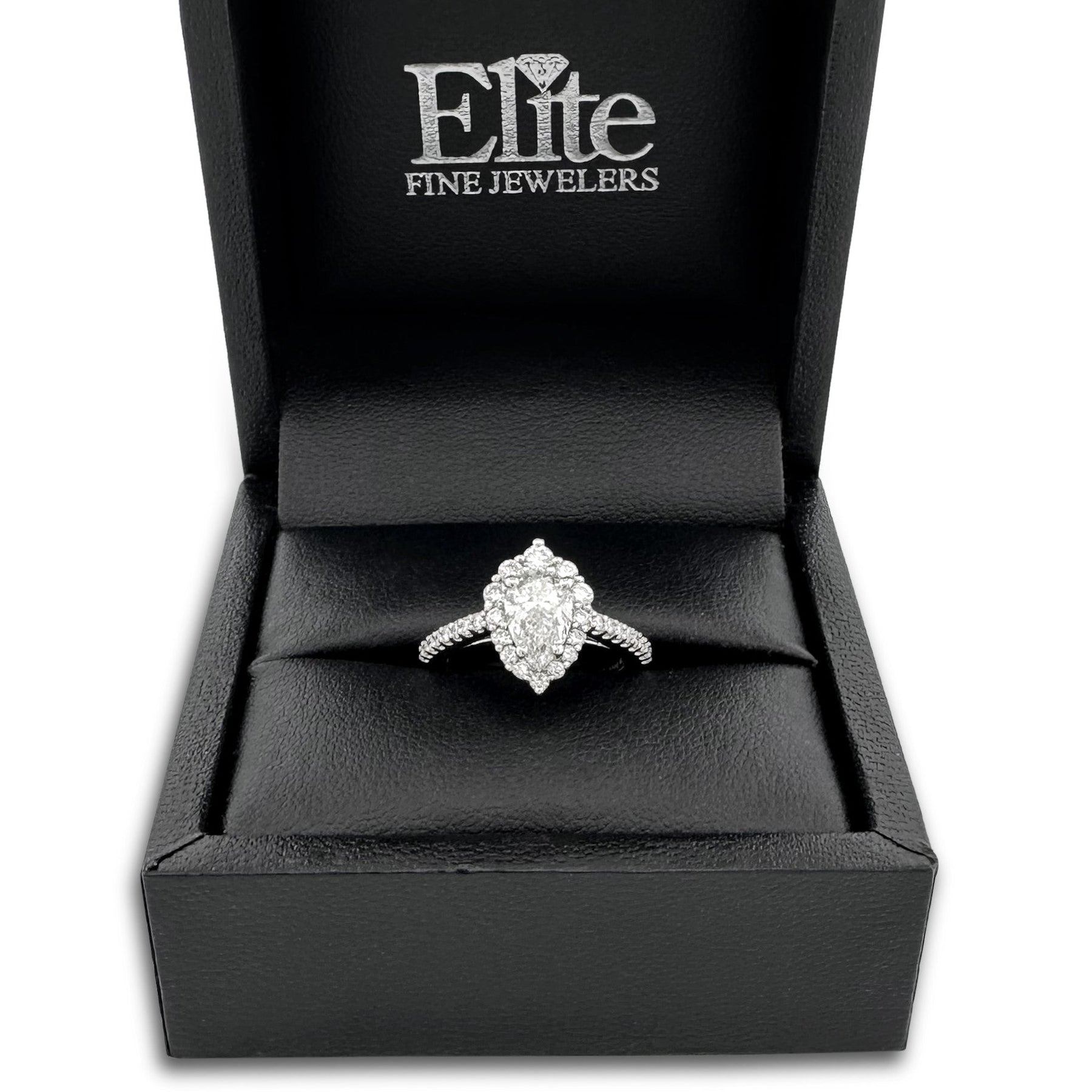 Are you a point up or point down pear fan? This ring is gorgeous either way! Centering on a 1.01 carat pear that is certified by GIA as H color and SI1 clarity. Round brilliant diamonds surround the pear like a halo and continue down the sides for a pleasingly balanced design. Set in 14 karat white gold.