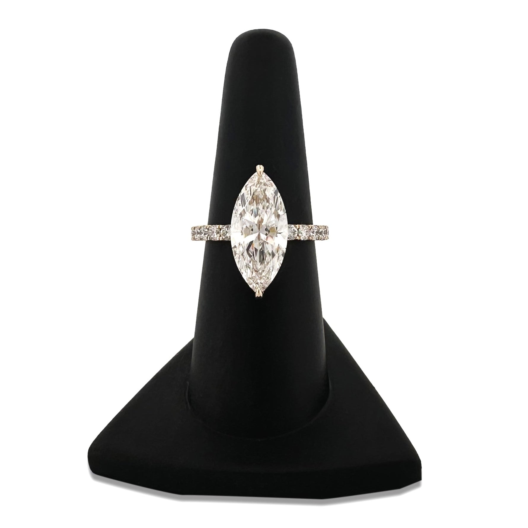 Mesmerizing marquise cut lab-grown diamond engagement ring. It centers on a 4 carat marquise cut certified by IGI. It is set with two claw prongs that secure the stone with the least amount of metal showing. Round brilliants form a hidden halo and continue down the shoulders. Set in 14 karat yellow gold. Sure to enchant your loved one!