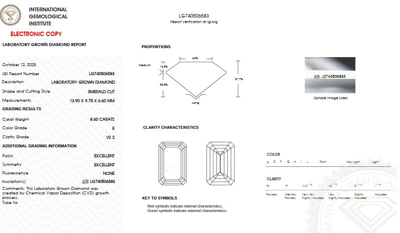 Wow! This is one gorgeous emerald cut lab-grown diamond engagement ring. On your finger, it looks like a classic 3-stone ring; an 8.60 carat emerald cut certified by IGI as E color and VS2 clarity, with tapered baguette sides. But get closer! Underneath round brilliants form a hidden halo for the emerald and baguettes, line the undergallery and continue down three sides of the band. An amazing 10.39 carats total weight are set in 14 karat white gold. Truly beautiful from every angle!
