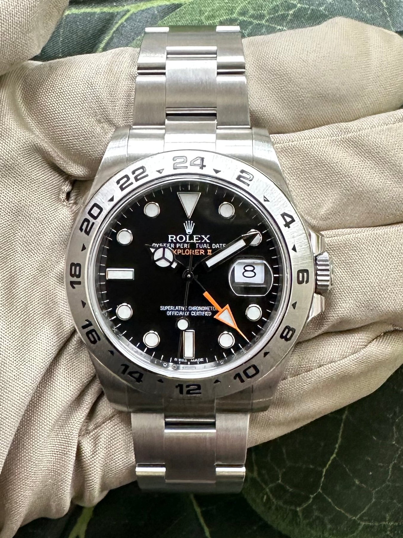 Pre-owned Rolex Explorer II. Known for its fixed 24 hour bezel and additional orange hand that enables the wearer to know if it's day or night regardless of the terrain they are exploring. It has the black dial and the 42mm case. This watch is in very good condition; slight scratches on bezel, scuff on caseback. This watch comes with its original box, card and manual.