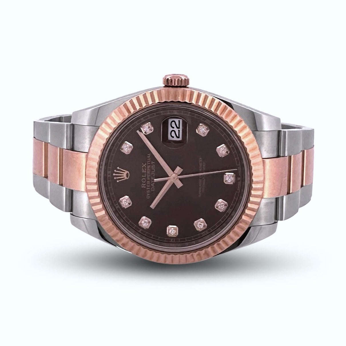 Pre-owned, 2021 Rolex Datejust in 18 karat rose gold and stainless steel. Gorgeous, large sized 41mm featuring a sweet chocolate dial with diamond markers, a fluted rose gold bezel, and rose gold and stainless steel oyster bracelet. The watch is in excellent condition; like new. The watch comes with its original box and card.