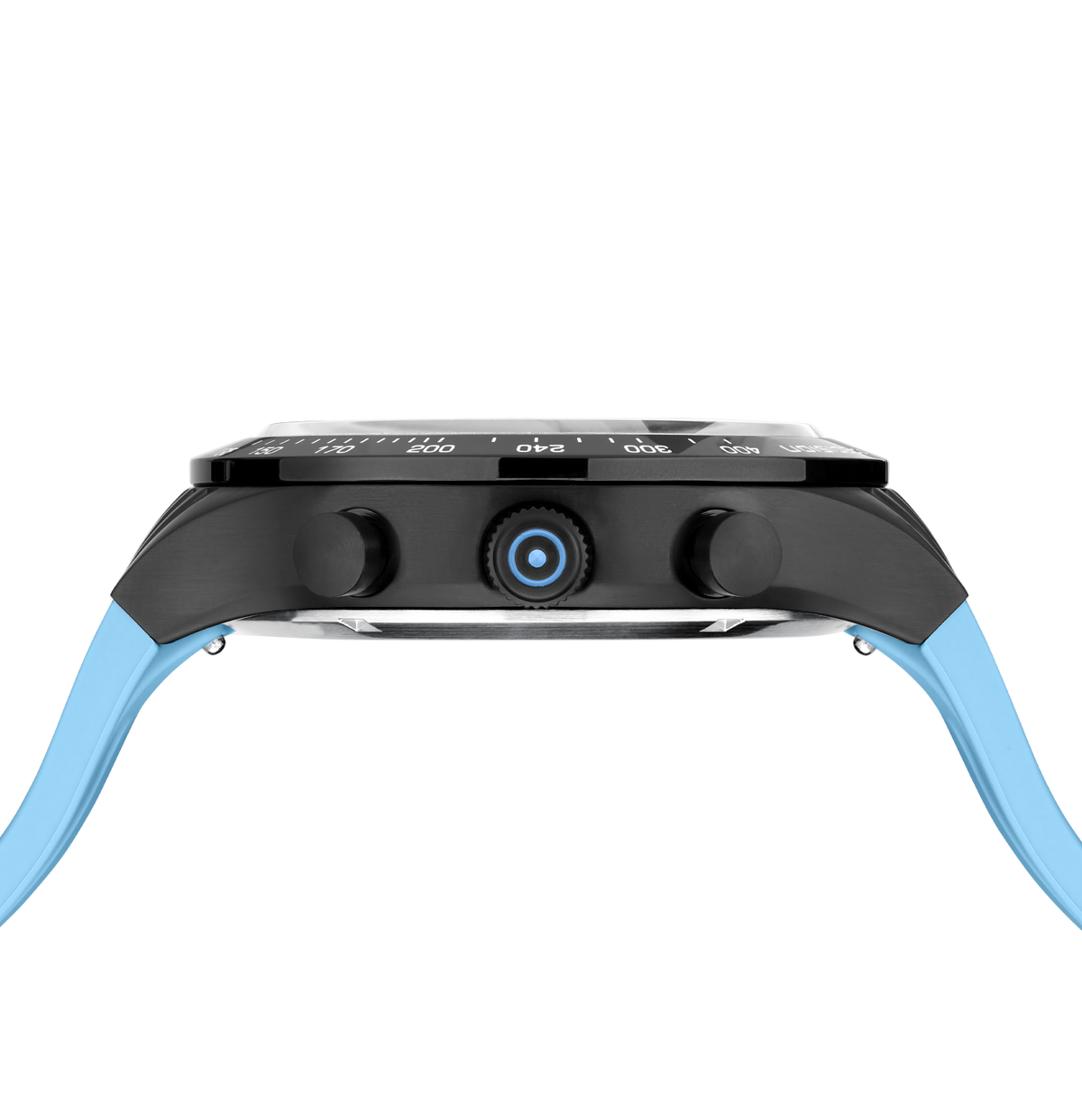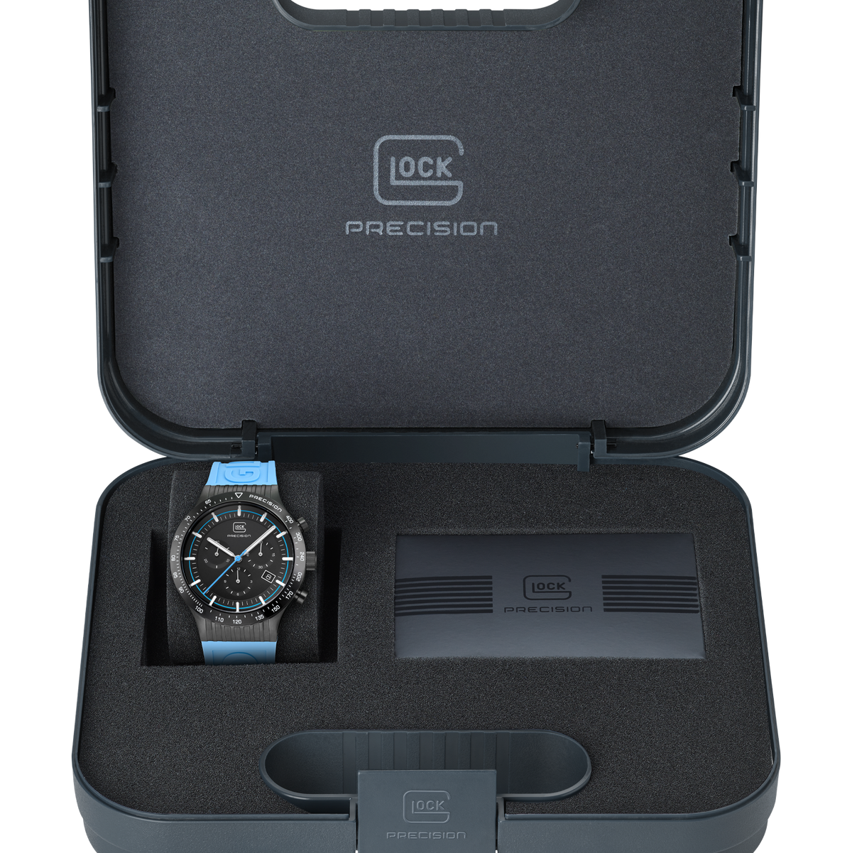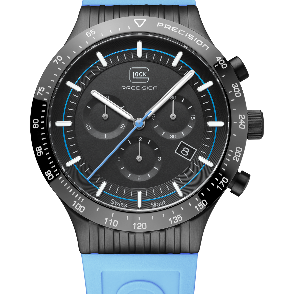 Elite Fine Jewelers is proud to be your local GLOCK watch dealer! We love the color combination of black and light blue on this one. The watch features luminous hands and markers, 3 chronograph subdials, date at 4 o'clock and the silicone strap has the GLOCK lettering. This brand new watch comes with a case and manual.