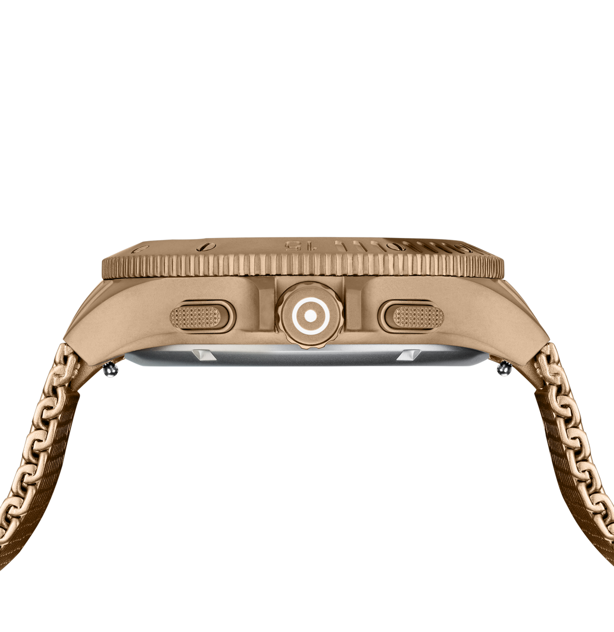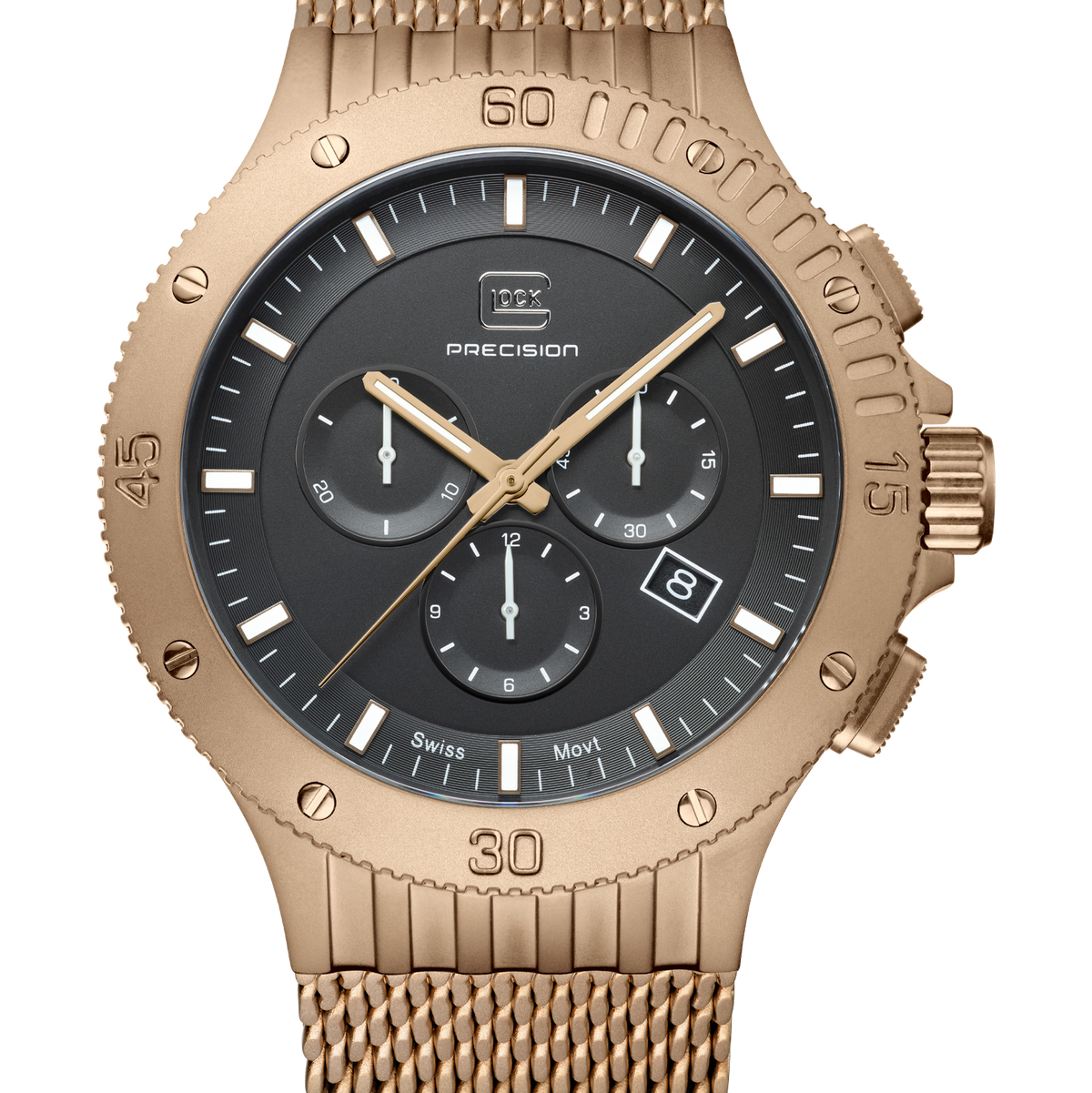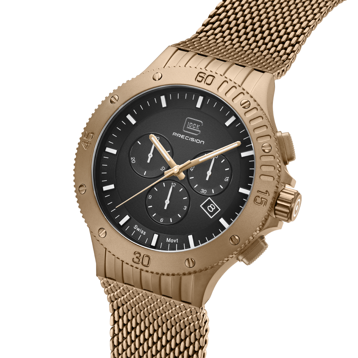 Elite Fine Jewelers is proud to be your local GLOCK watch dealer! Here is a rugged looking chronograph with a "coyote" tone-stainless steel case and mesh bracelet. Featuring a black dial with the date at 4 o'clock, three chronograph subdials and a rotating bezel. This brand new watch comes with a case and manual.