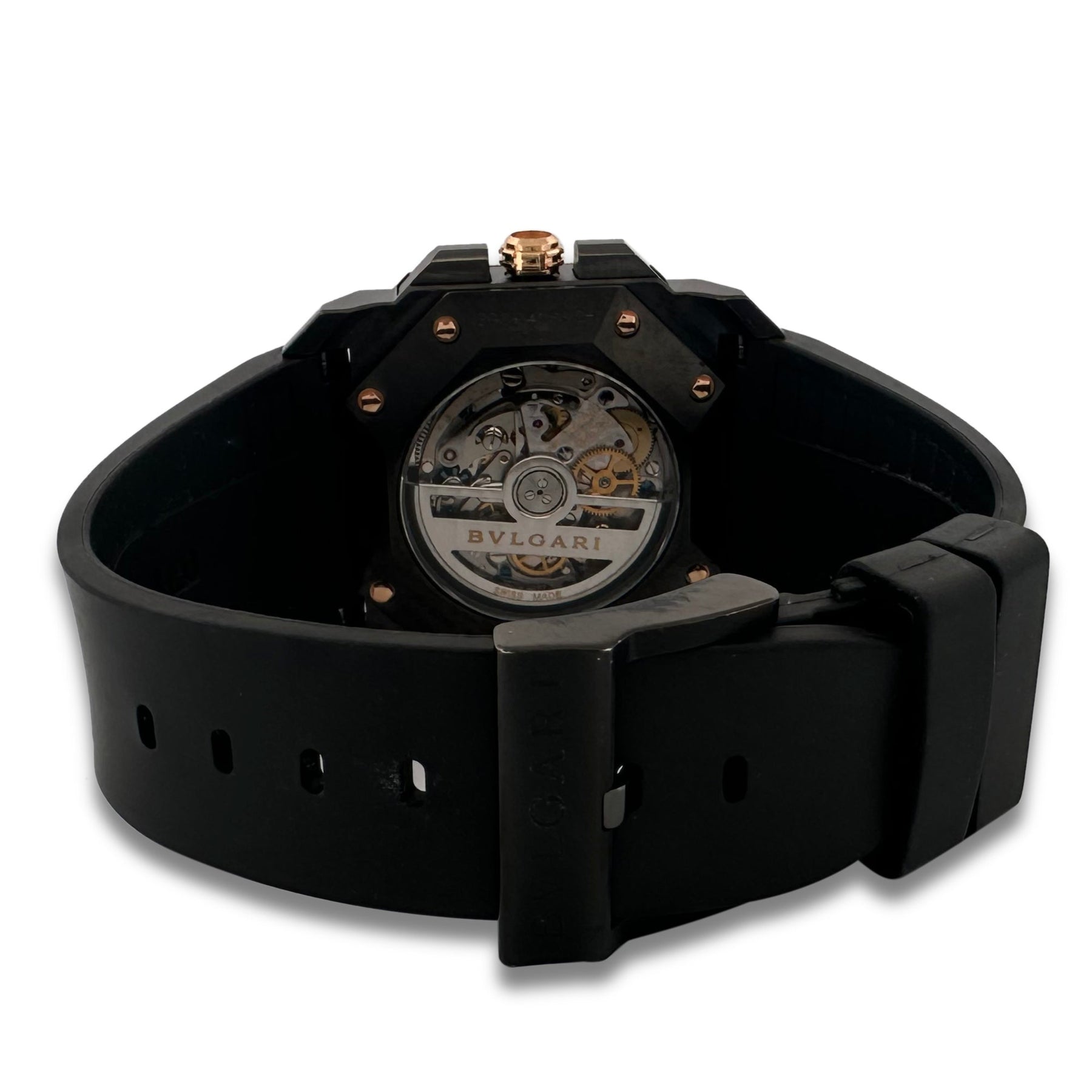 Pre-owned Bvlgari Octo Finissimo gent's watch. This is a bold watch with satin-finish rose gold octagonal bezel, rose-colored hands and markers and a skeleton case back. The watch is in very good condition; scratch on crown and bezel, slight strap wear. This watch comes with its original box, no original paperwork.