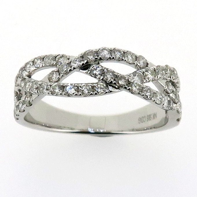 This woven design ring has 2/3 carat total weight of earth-mined round brilliant diamonds. Set in 14 karat white, rose or yellow gold. Lovely gift for an anniversary or just because.
