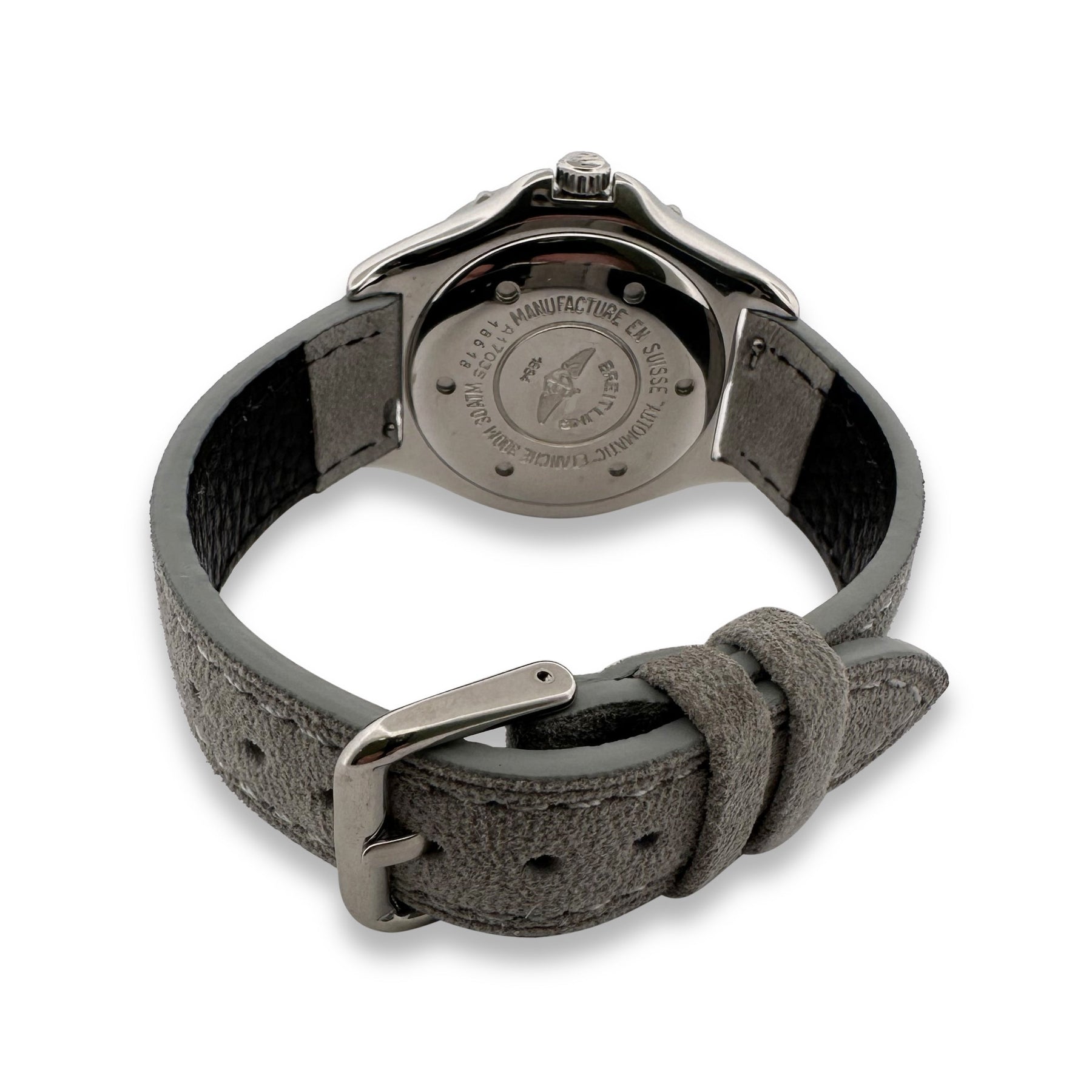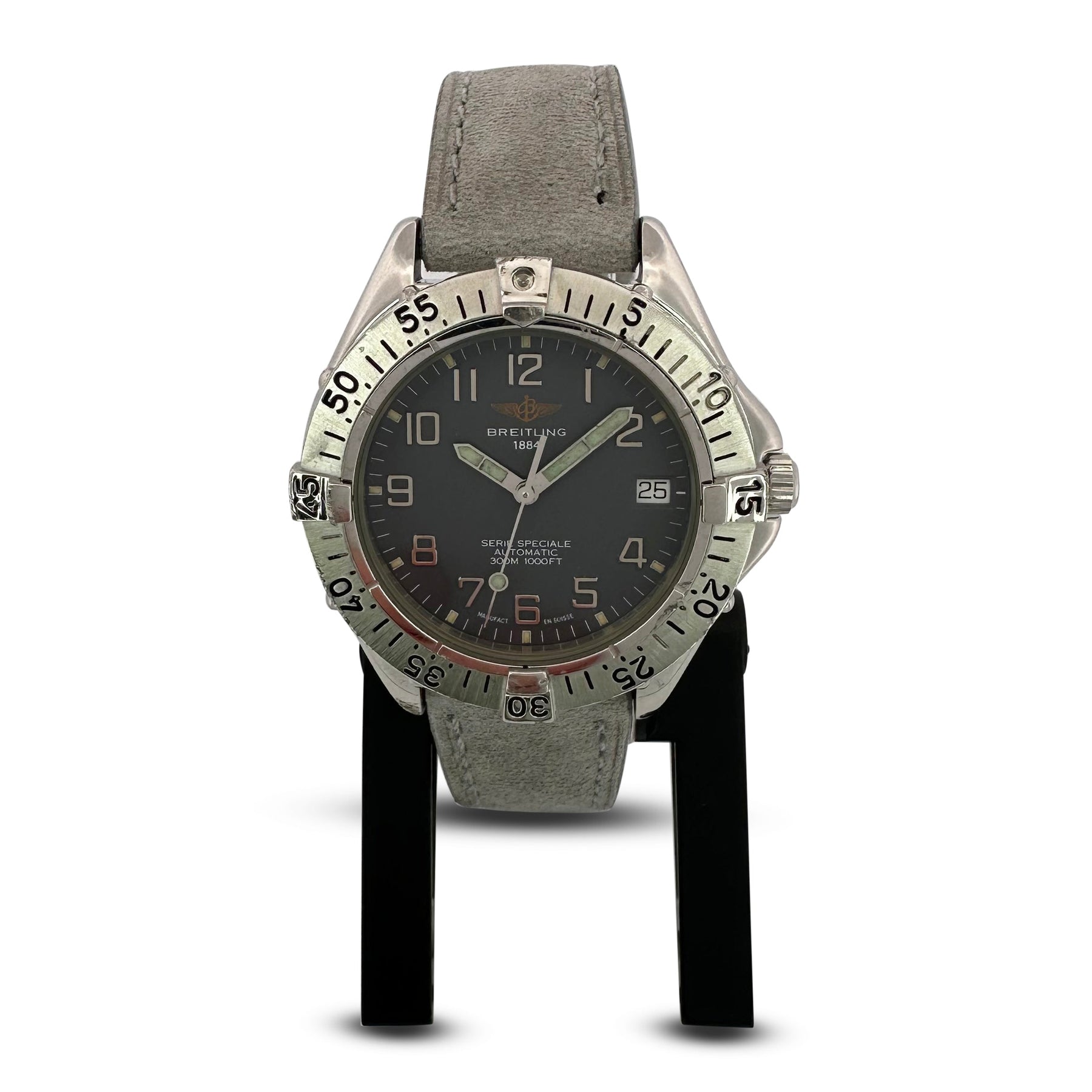 Pre-owned Breitling Colt Automatic strap watch. This watch has a cool, grey palette. It features a blue grey dial and an aftermarket grey suede strap. The unidirectional bezel has rider tabs for ease of use. Condition is good; scratches on bezel, damage to bezel markers, missing lume pip at 12. This watch does not come with its original box or original paperwork.